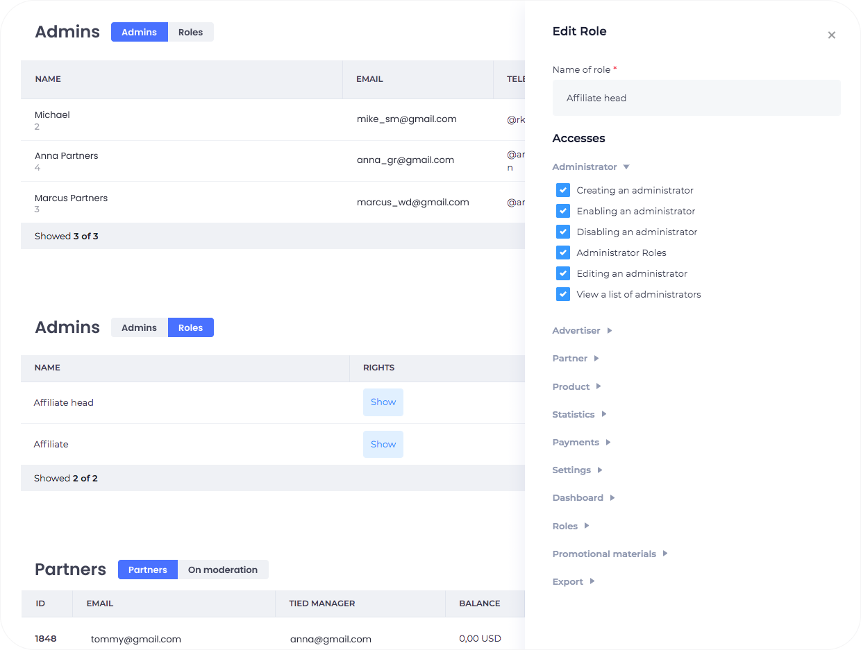 With Alanbase, you have access to multiple levels of access with flexible permission settings: administrators, advertisers, and partners.