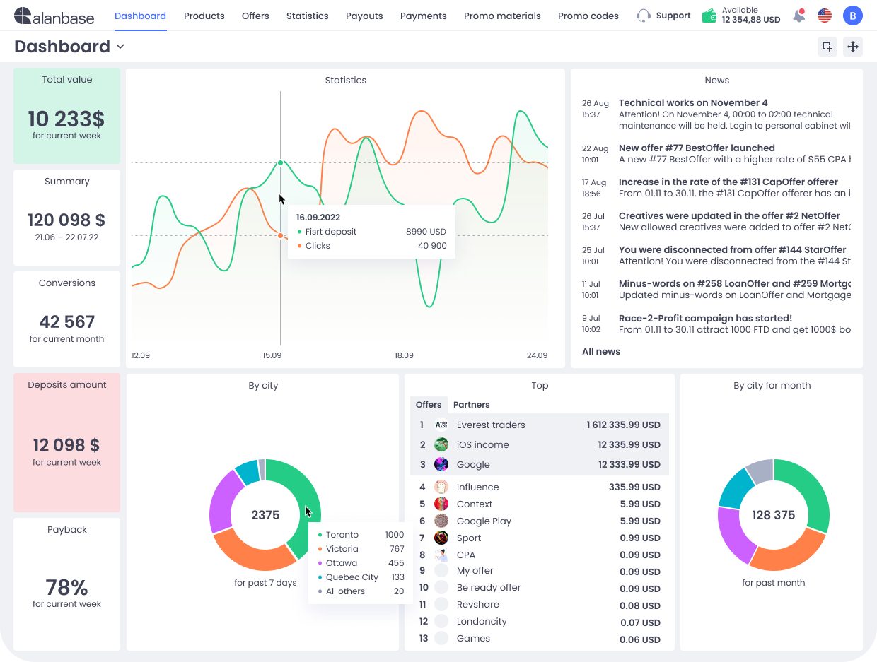 With Alanbase, you will receive a flexible payout module: convert statistical indicators and process payments with just 2 clicks.
